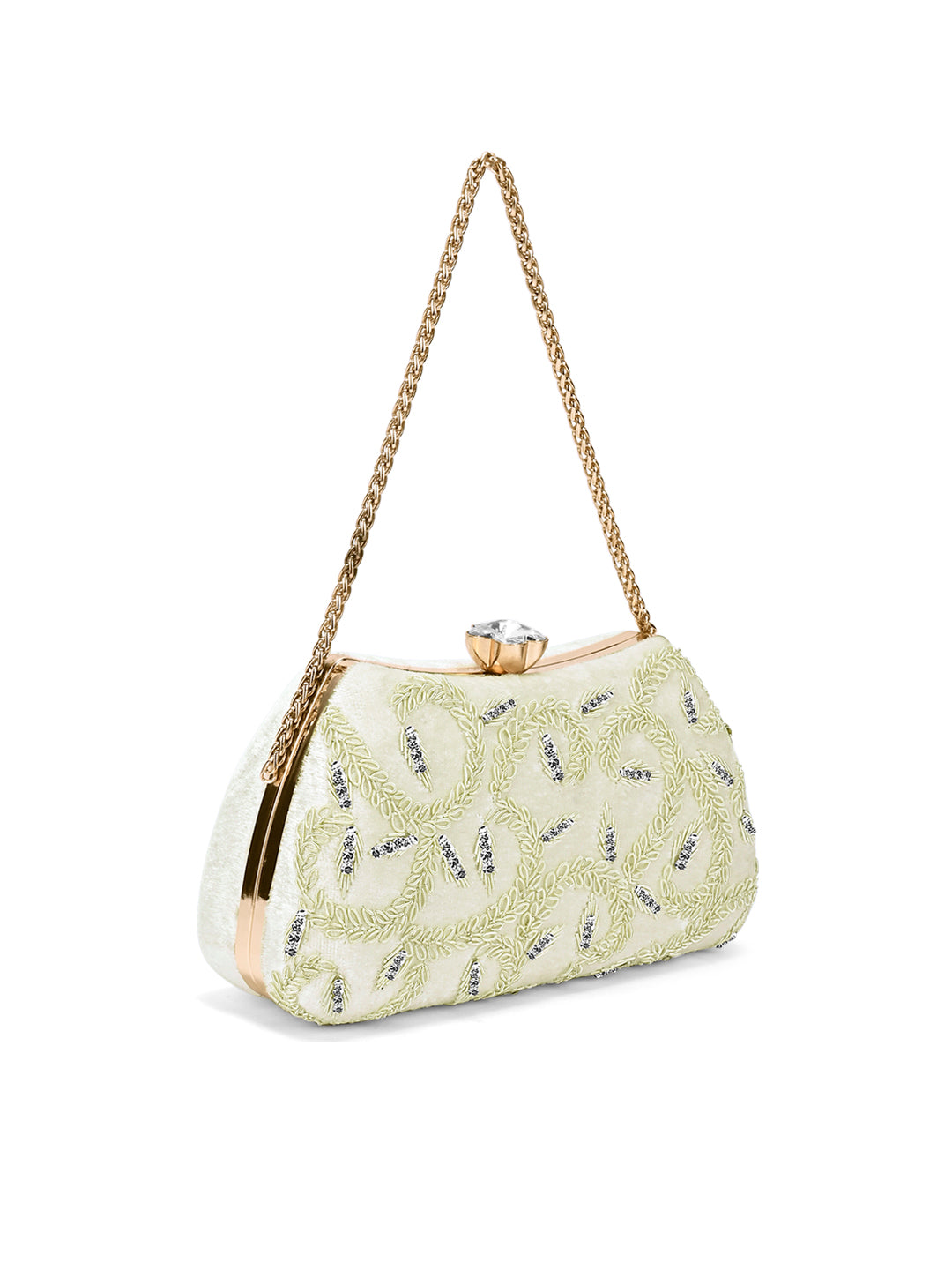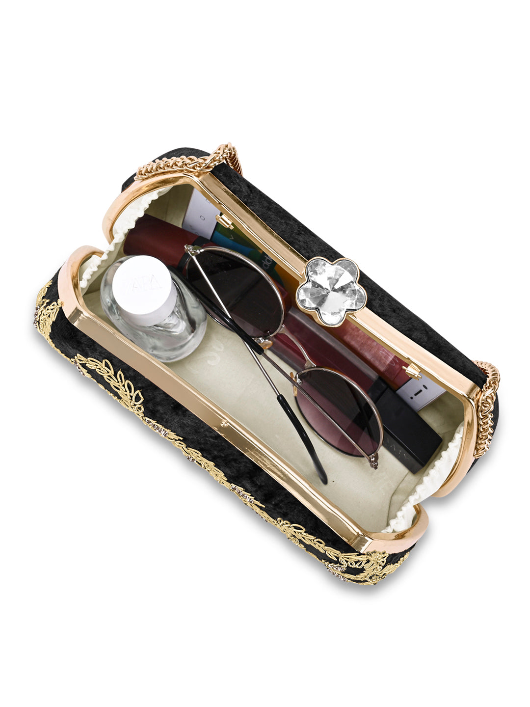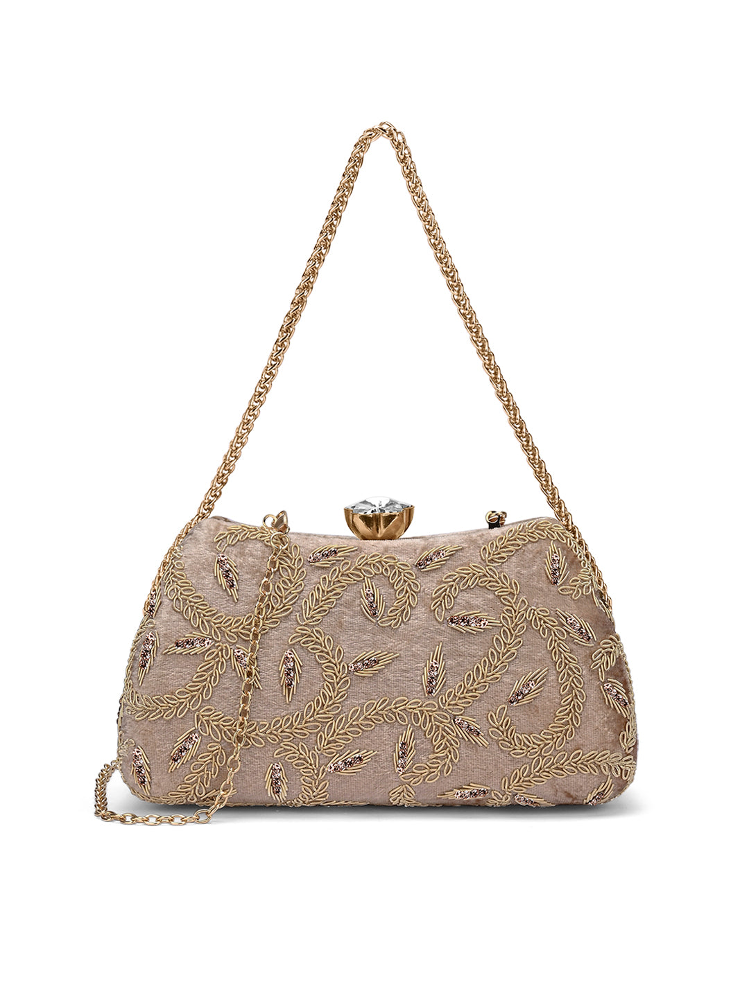 • The satin feel of the bag adds a richness and elegance to any outfit. The gold plated handles and embellished stone flower details on the front add a good balance to subtly make the bag more fancy for functions or festivals.