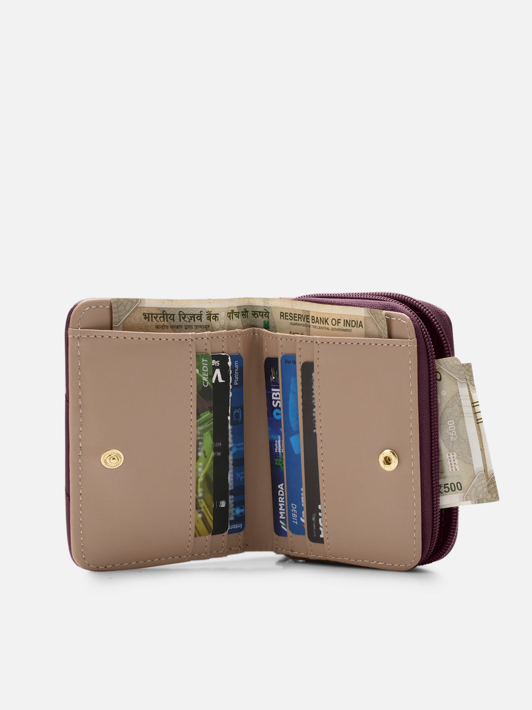 - wallet boasts a thoughtfully designed interior, complete with a metal zip closure dedicated to your coins. Additionally, a convenient press button closure reveals a well-organized interior, featuring a spacious compartments for cash and an array of slots to accommodate your cards.