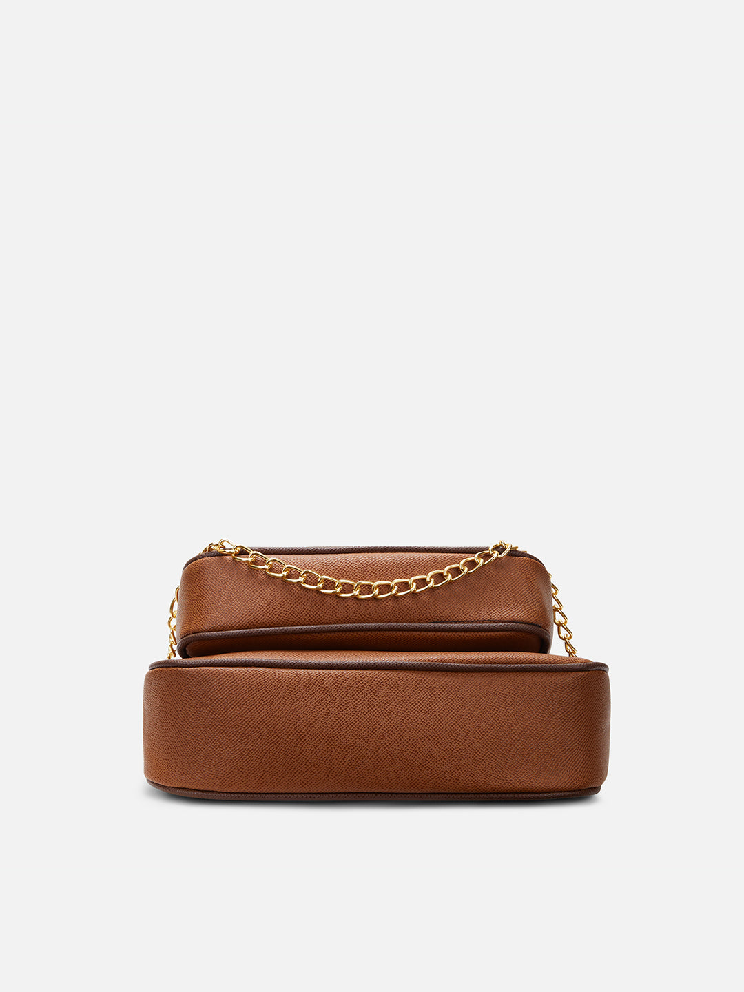 - This hybrid cross-body bag, known as the Multi Pochette Slingbag, seamlessly integrates a Hobo sling, a Mini Hobo Pochette, and a Round Coin Purse, all complemented by an embellished chain.