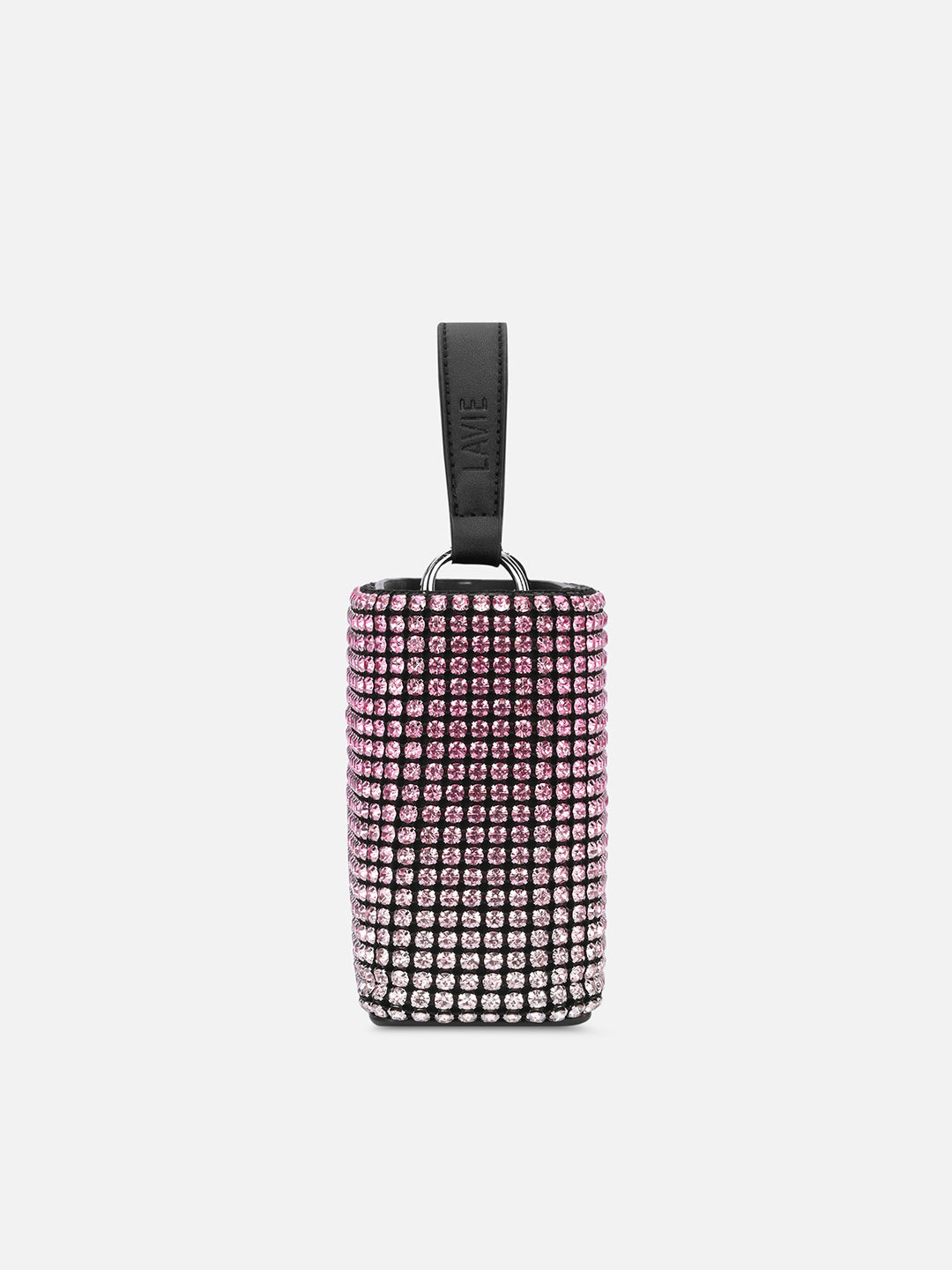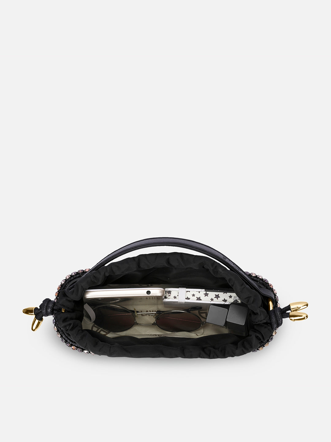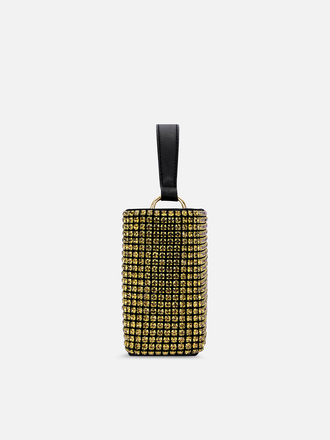 • Shine bright at every celebration with this crystal-studded bucket bag.