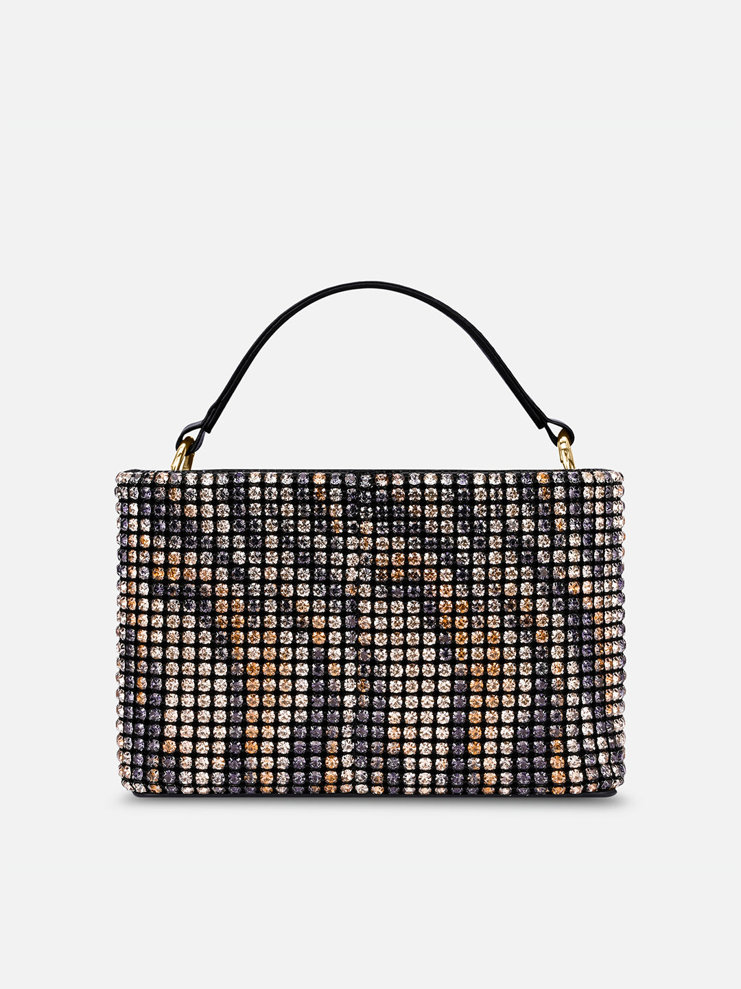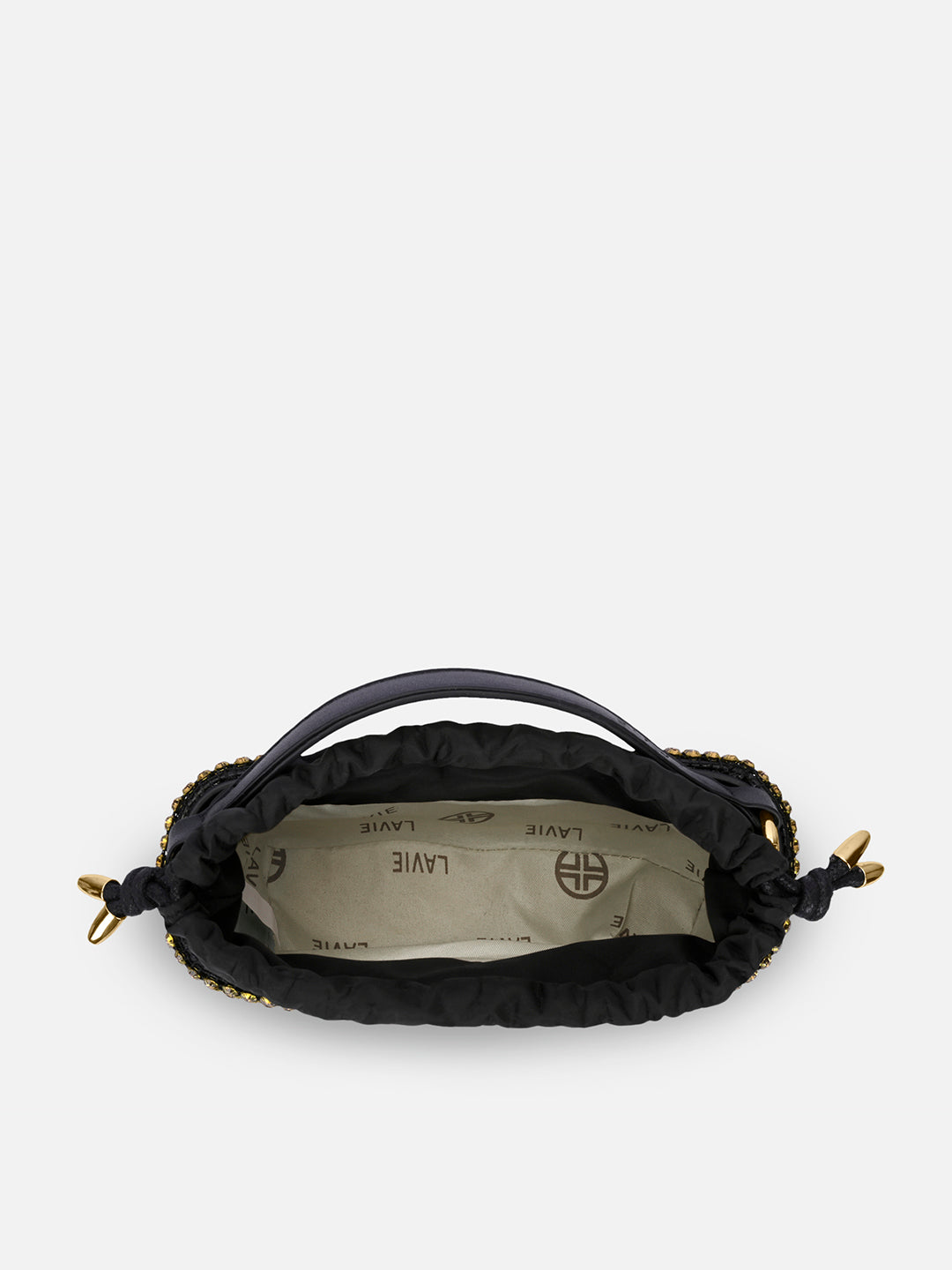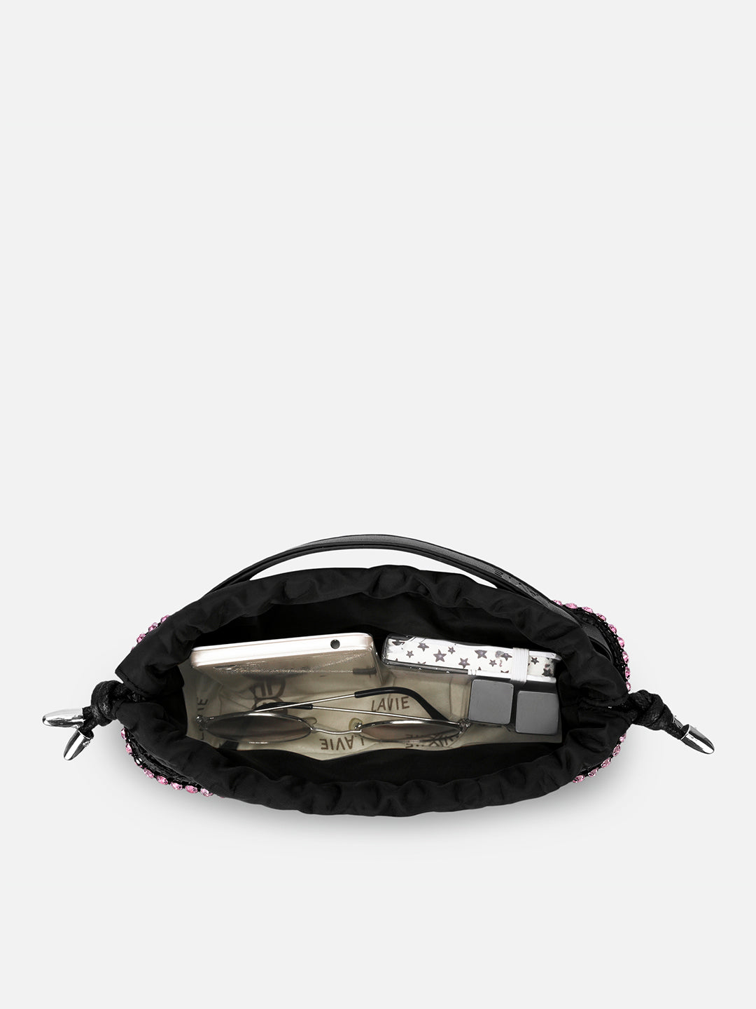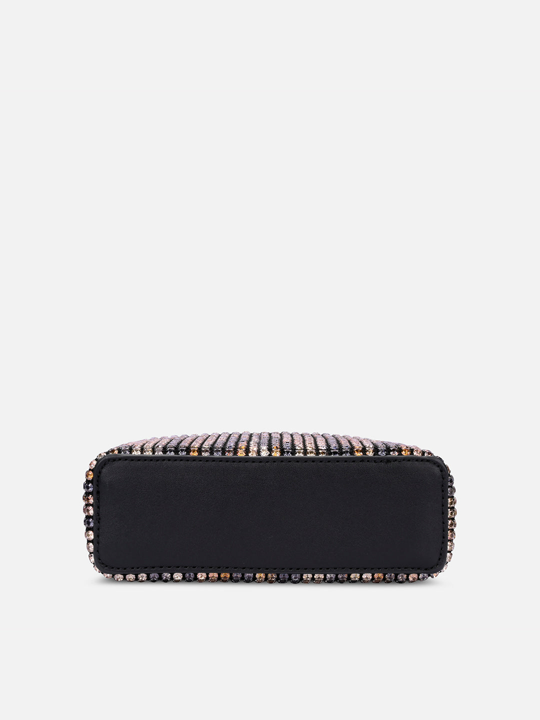 • Shine bright at every celebration with this crystal-studded bucket bag.