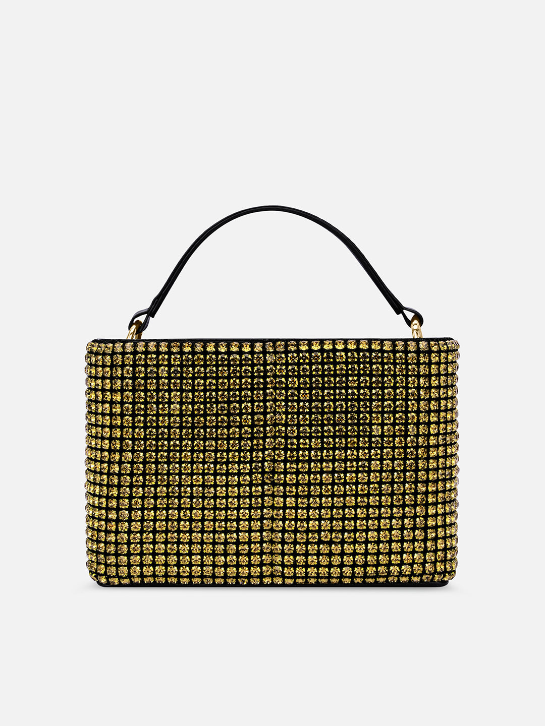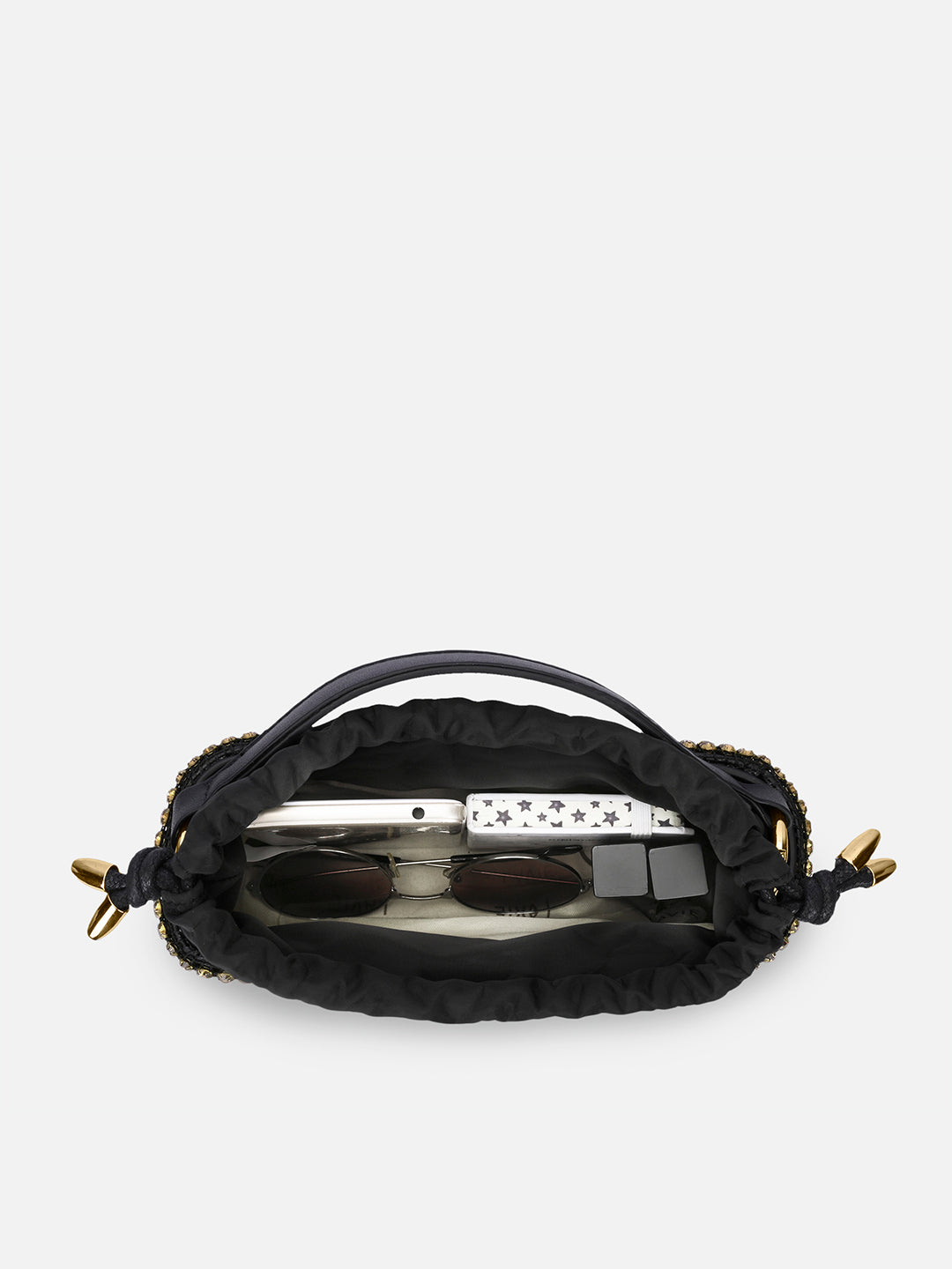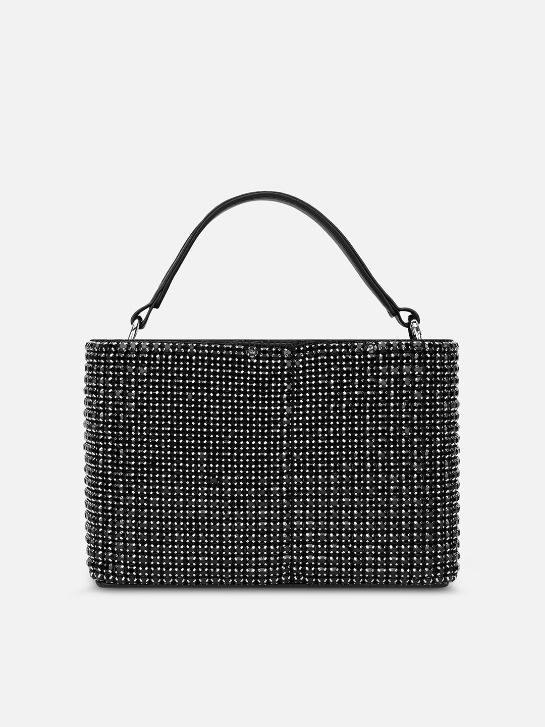 - Shine bright at every celebration with this crystal-studded bucket bag.