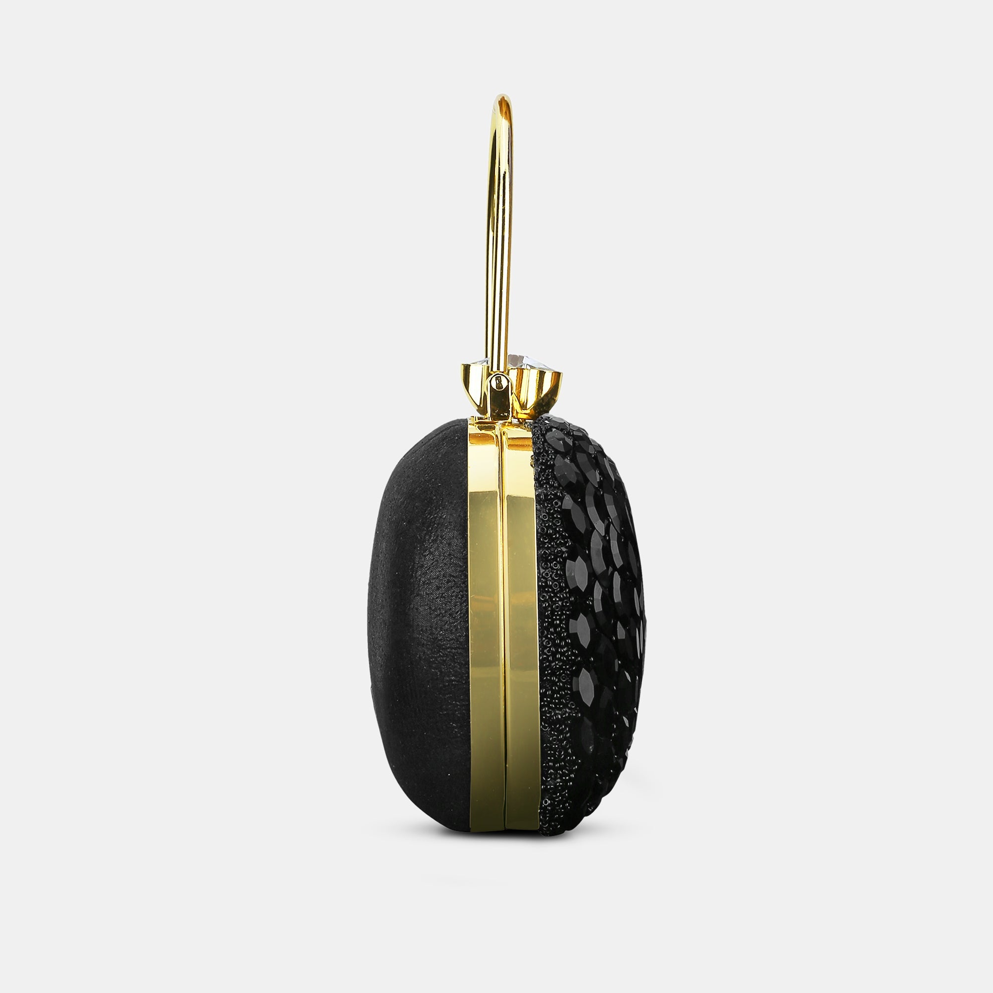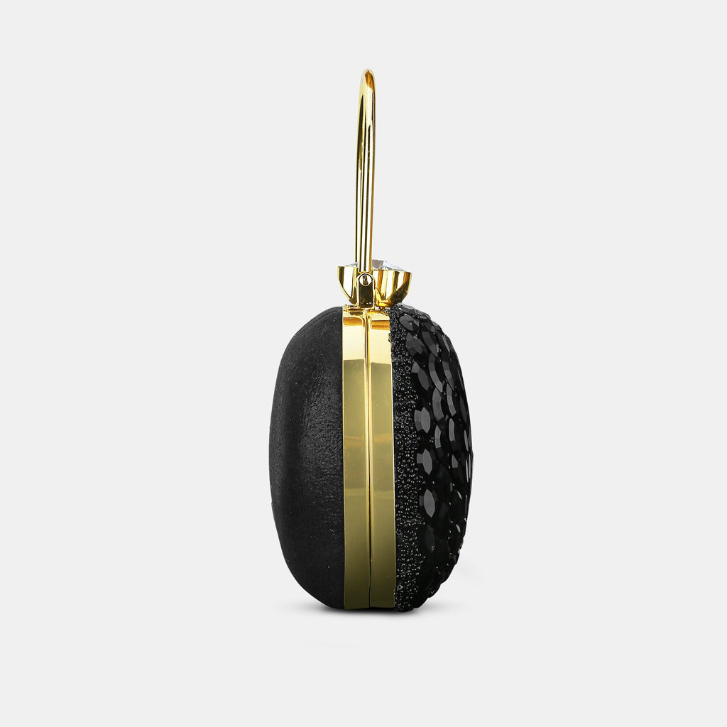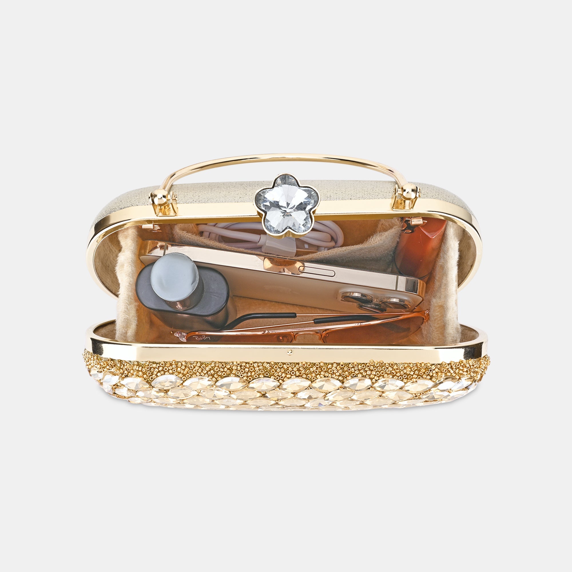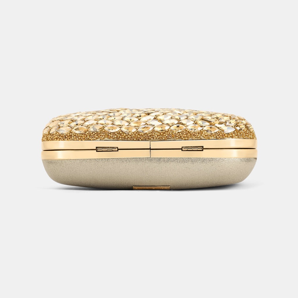 - A fully embellished clutch with jewel-like stones that catch and reflect light, creating a captivating allure. .