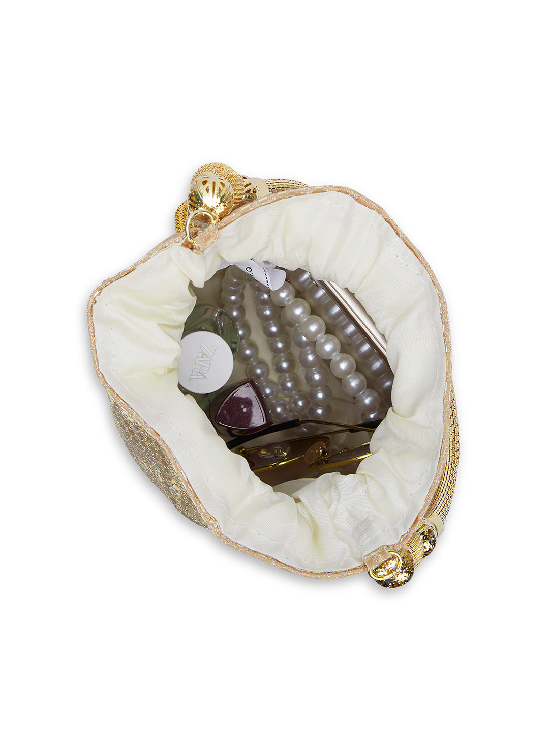 - These stylish structured round Potlis comes with shimmer material detailing all over. It has a matching pearl handle to make it easy for you to carry.