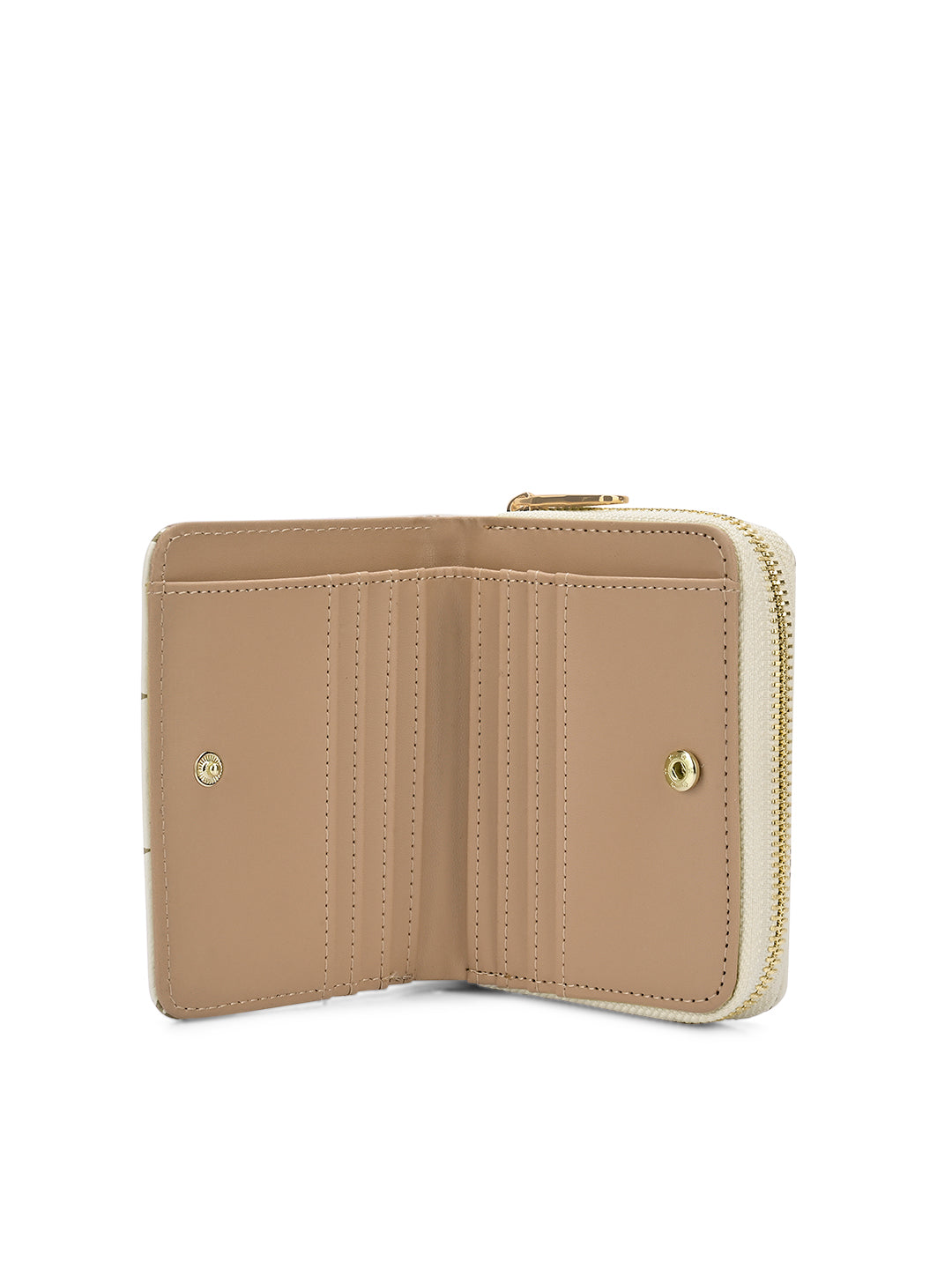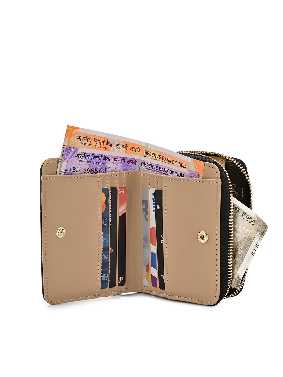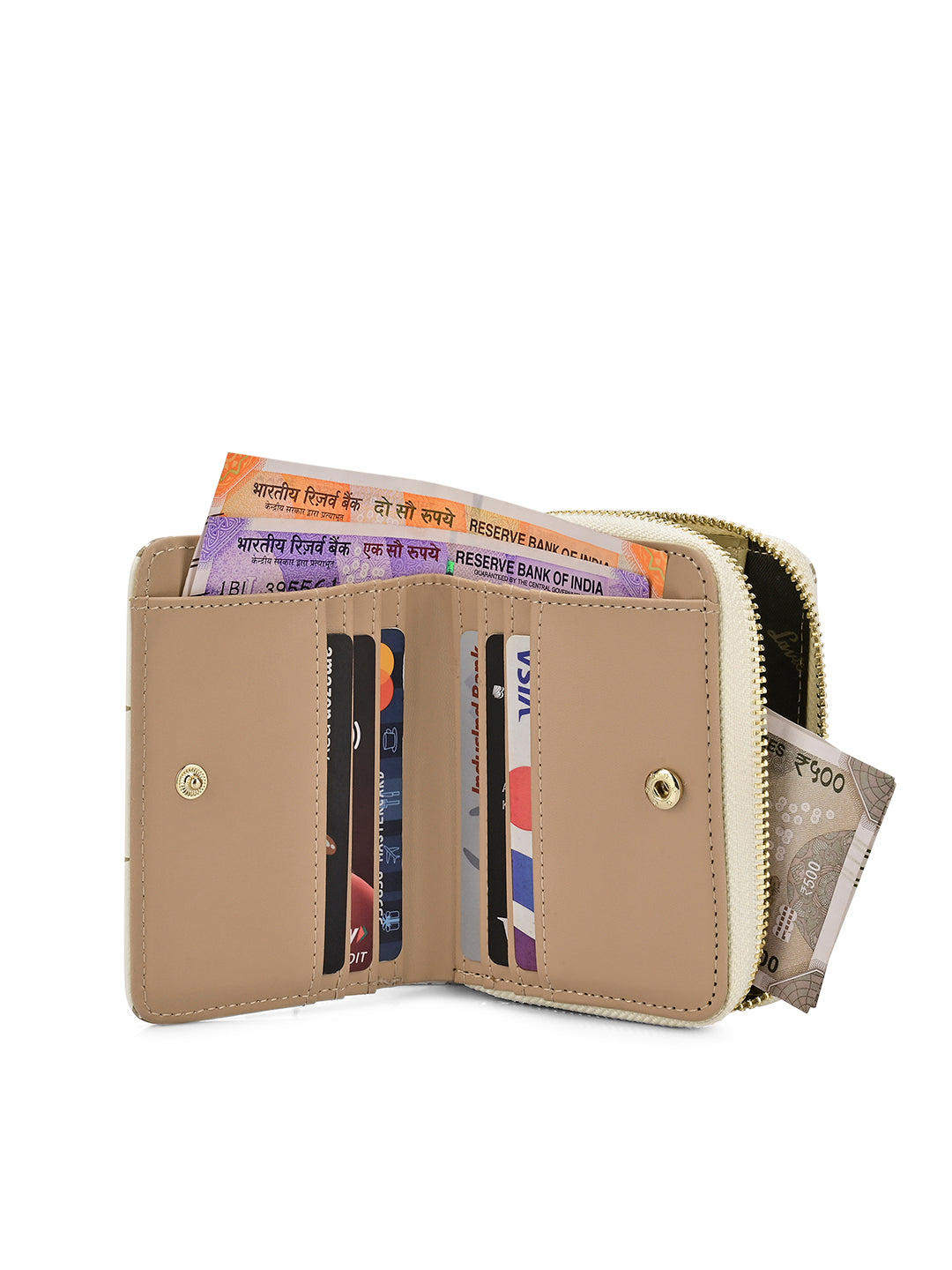- The wallet features a metal zip closure for coins and a press button closure that opens to two cash and multiple card compartments. This makes it easy to organize your belongings and keep everything secure and easily accessible.
