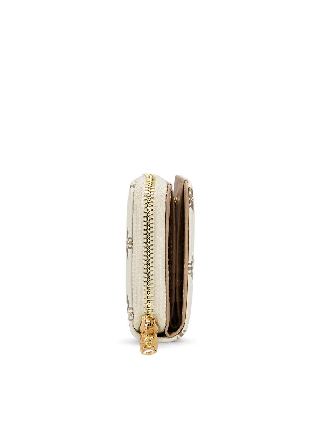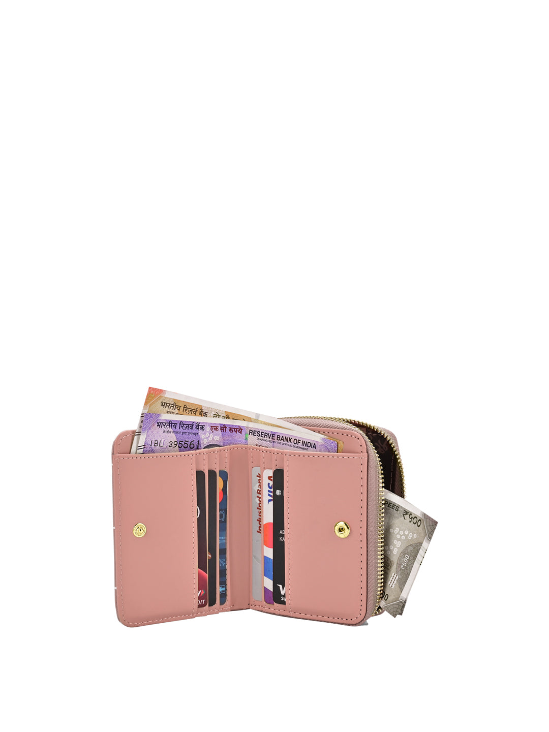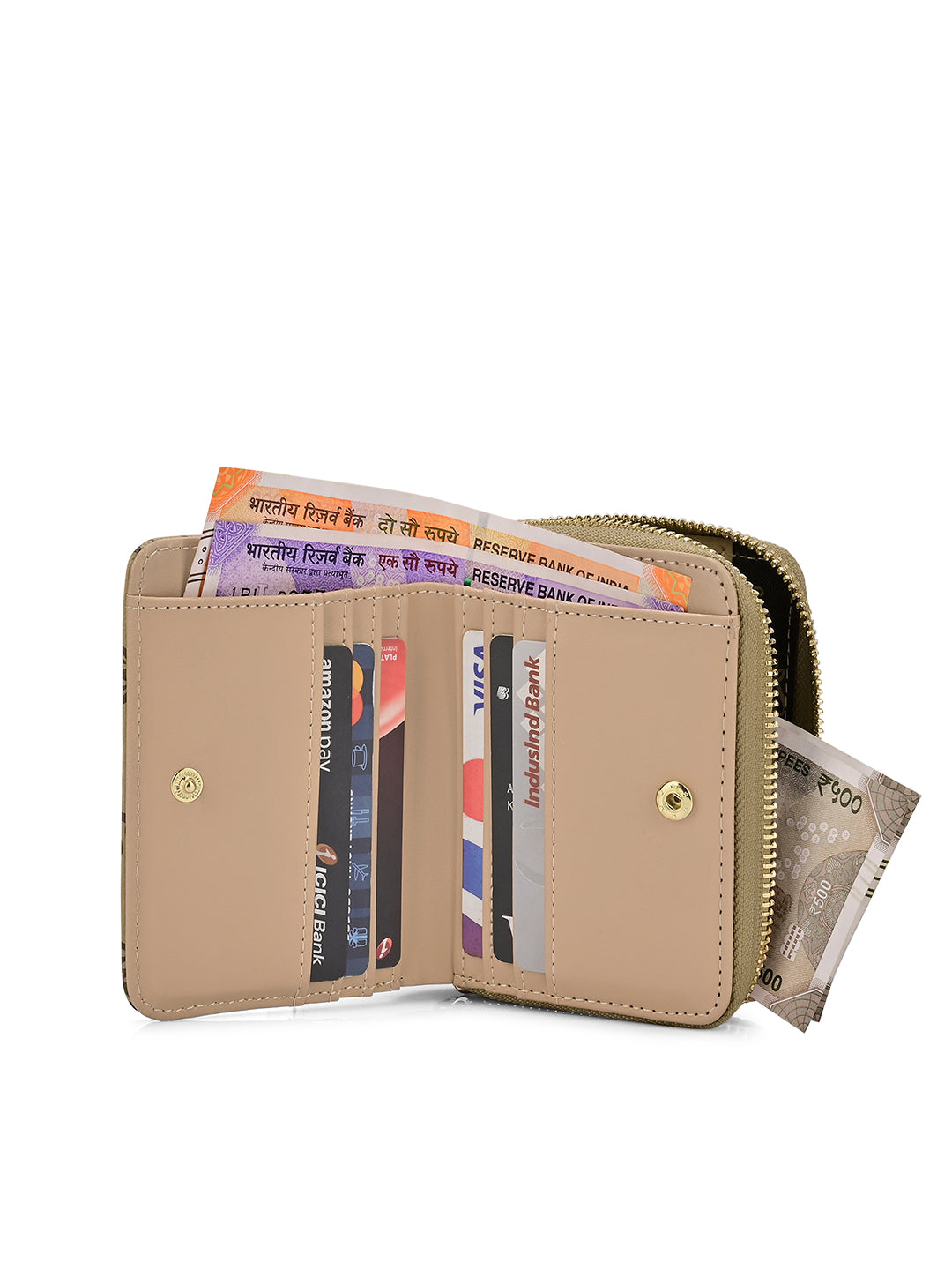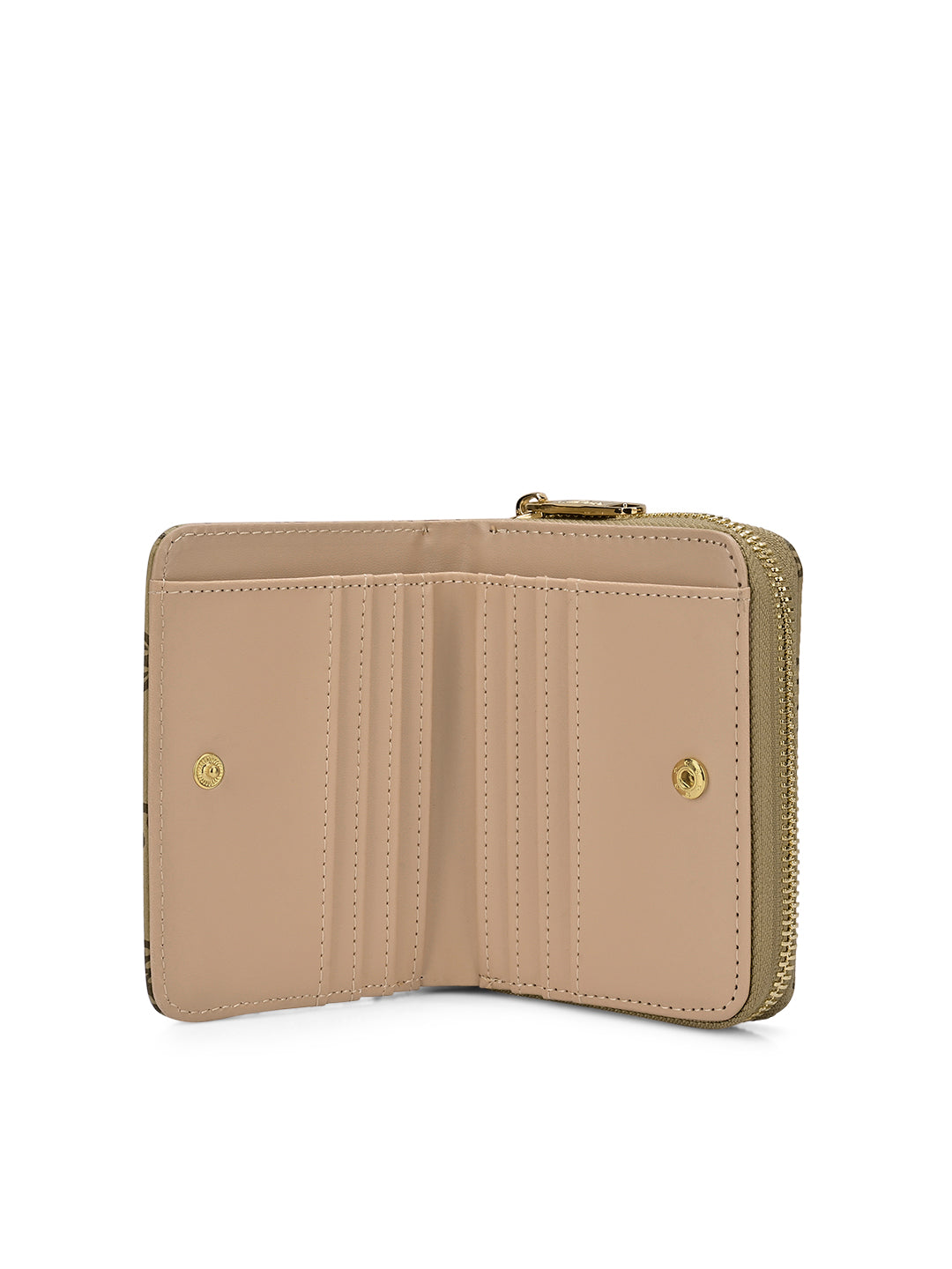 - The wallet features a metal zip closure for coins and a press button closure that opens to two cash and multiple card compartments. This makes it easy to organize your belongings and keep everything secure and easily accessible.