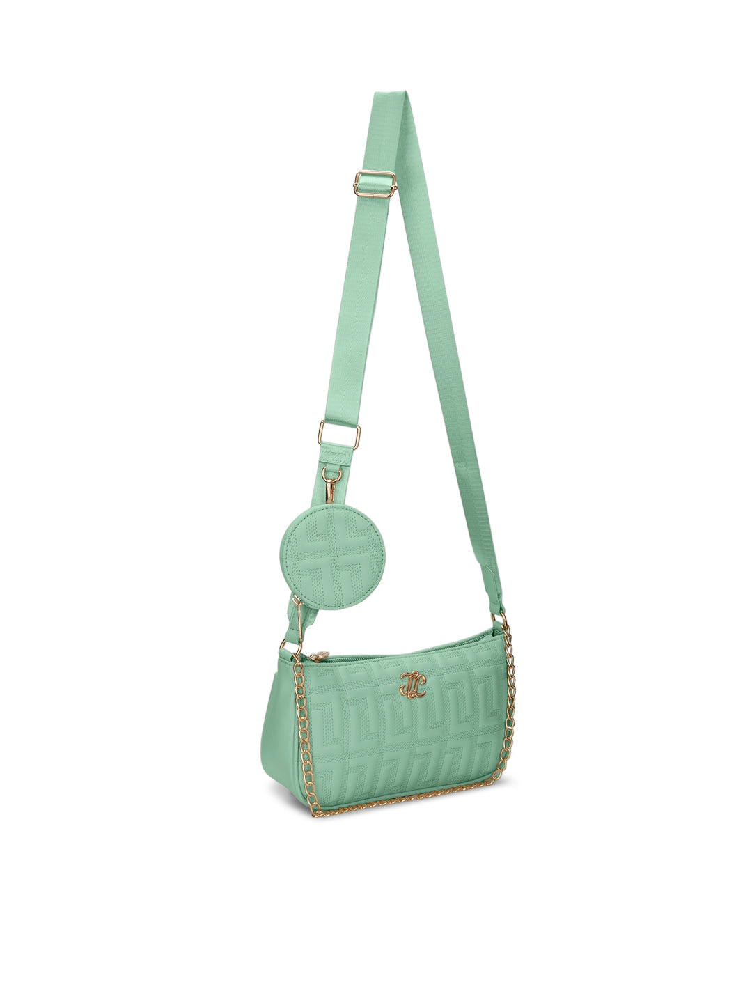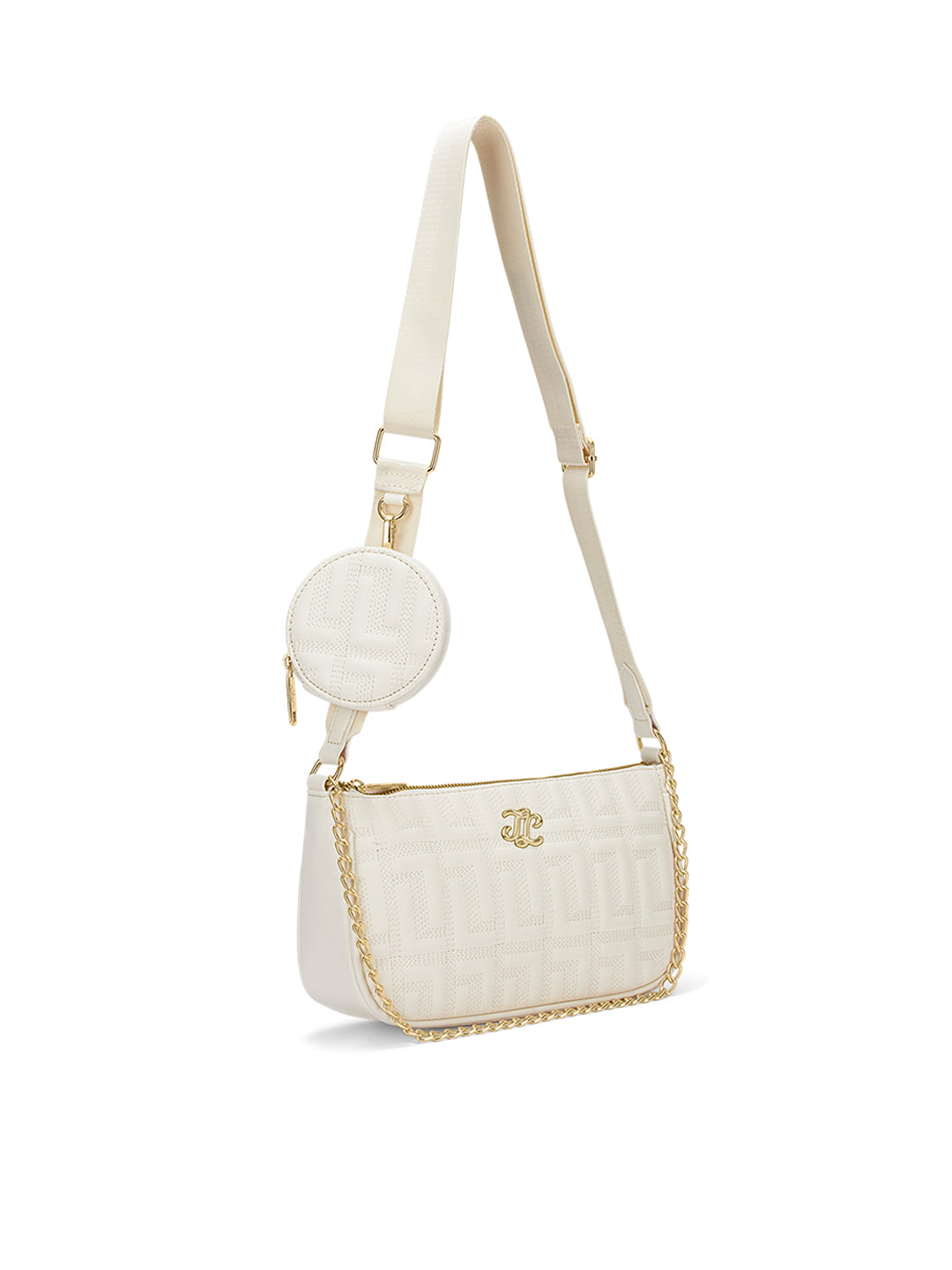 • This hybrid cross-body bag, known as seamlessly integrates a Hobo sling, a Mini Hobo Pochette, and a Round Coin Purse, all complemented by an embellished chain.